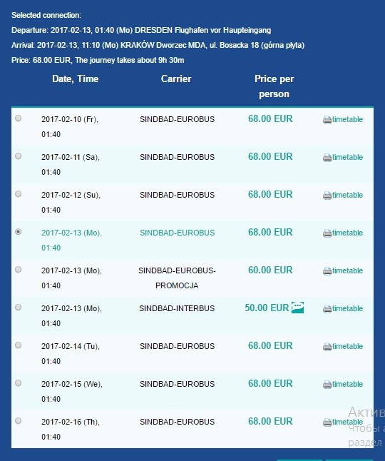Данная компания предоставляет возможность отправиться в Краков из аэропорта Дрездена. Такая поездка возможна ежедневно, это ночной переезд. Автобус отправляется в 01:40 из аэропорта Дрездена и прибывает на центральный автовокзал Кракова в 11:10. Время в пути - 9 ч. 30 мин.