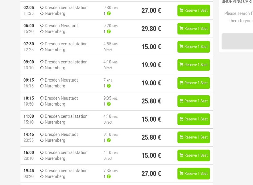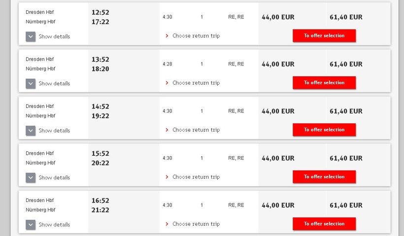 Монополистом по железнодорожным перевозкам в Германии является компания Deutsche Bahn. Из Дрездена в Нюрнберг есть поезда, но все они делают одну пересадку в Хофе. Зато ходят каждый час, а в пути 4 часа 30 минут. Расписание можно посмотреть на сайте DB. Некоторые интересные подробности о поездах в Германии советую почитать здесь.