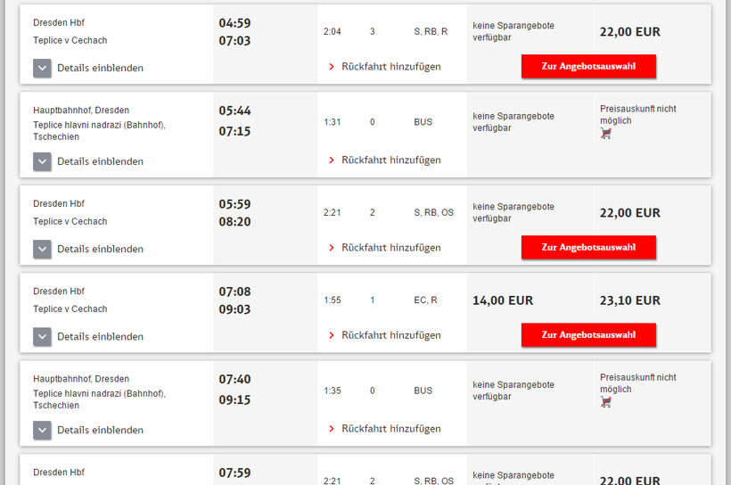 Как я уже упоминал, из Дрездена в Теплице можно доехать и на поезде, но тогда придётся делать как минимум одну пересадку. Такая поездка получится намного дольше, чем дорога на автобусе, да и по деньгам выгоды какой-то нет, поэтому я даже не стал вдаваться в детали этого маршрута.
