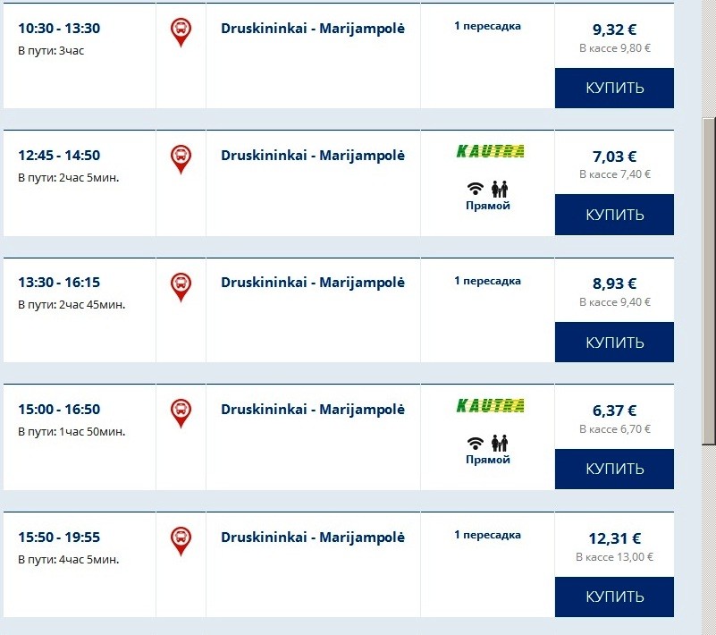 Прямого автобусного рейса в данный момент нет. Но есть вариант поездки с пересадкой. Сначала вам нужно будет добраться до города Мариямполе. Прямые рейсы без пересадки есть в 12:45 и 15:00 ежедневно. Их выполняет компания Kautra. Время в пути между городами около 2 часов. Ознакомиться с расписанием автобусов, следующих до Мариямполе можно на сайте eurolines.lt.