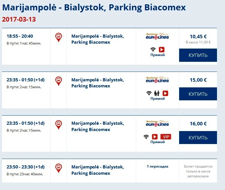На этом же сайте можно найти билеты из Мариямполе до Белостока. Автобусы в данном направлении отправляются 3-4 раза в день в зависимости от дня недели. Первый рейс в 18:55, а последующие два-три с 23:00 до полуночи. Время в пути составляет около двух часов (плюс минус 15 минут).