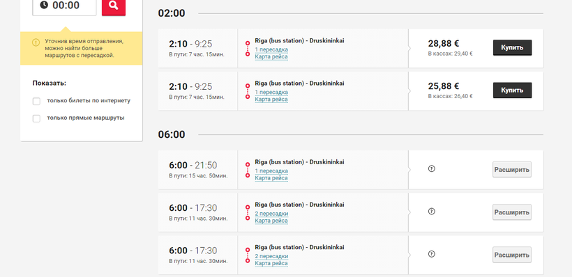 Этот автовокзал принимает все автобусы, прибывающие из других стран или отправляющиеся в другие страны. Всего есть два рейса, позволяющих добраться в Друскининкай, отправляющихся из Риги в 02:10 и в 06:00. Ехать придется минимум с одной пересадкой в Вильнюсе или Клайпеде. Время поездки зависит от выбранного маршрута и составляет от 7 до 15 часов. Лично мне кажется, что наиболее удобный автобус, отправляющийся ночью. Во-первых, вы не потратите целый день на дорогу, а во-вторых, в пути нужно будет провести меньше всего времени.
