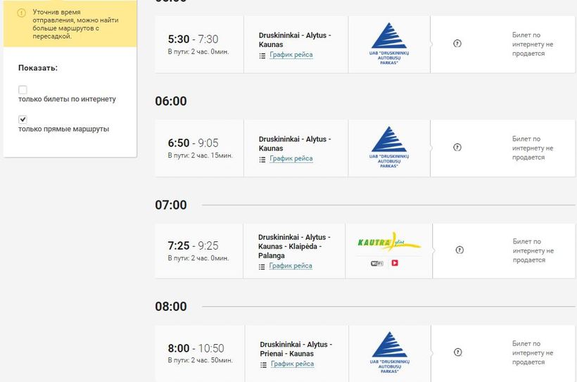 Билеты можно приобрести в кассе автовокзала, онлайн билет по данному направлению не продаются. Крайне рекомендую заранее посмотреть расписание, а затем заготовить записку с датой поездки, временем и названием станции отправления и конечного пункта, и сунуть ее кассиру. Русский понимают не всегда, и английский тоже, а уж отвечают обычно на литовском.