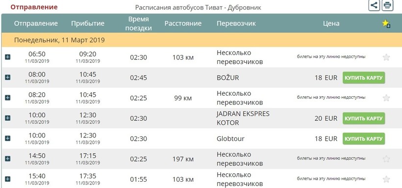 Тиватский автовокзал находится примерно в пятнадцати минутах ходьбы от местного аэровокзала. Отсюда в ежедневном режиме отправляется шесть автобусов до хорватского Дубровника. Расписание смотрите на скриншоте.