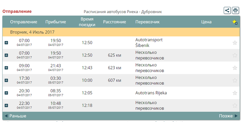 Из Риеки в Дубровник автобусов чуть больше. Отправляются они с автовокзала города в 07:00, 09:00, 17:30, 20:30, 22:30. Дорога занимает чуть менее 13 часов.