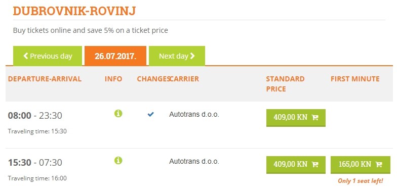 Билет на автобус можно купить за 165 хорватских кун (22 евро), но это цена со скидкой. В остальное же время он стоит гораздо дороже.