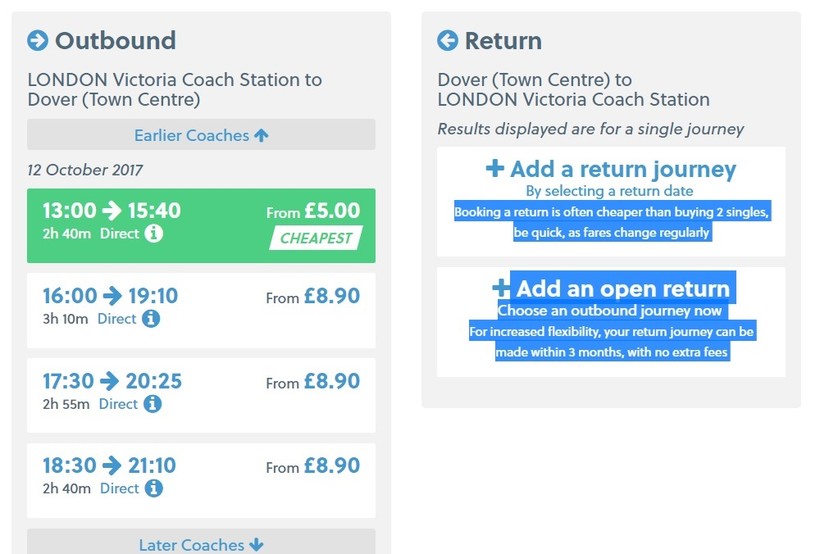 А вот автобусы из Лондона ездят по одному и тому же маршруту, отправляются от Victoria Coach Station, дальше на них можно сесть на остановках London Elephant and Castle, London Walworth, London New Cross Gate, Lewisham Clock Tower. Конечная в Дувре Dover (Town Centre) находится на Pencester Rd, но перед этим можно выйти в порту на Dover (Ferry Port). Весь маршрут занимает 2,5-3 часа.
