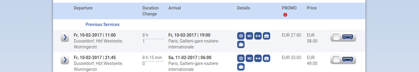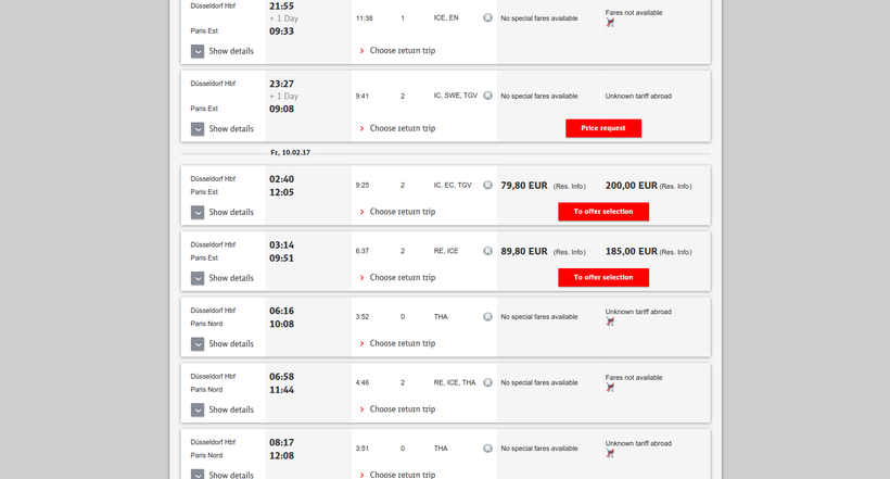 Железнодорожное сообщение между Дюссельдорфом и Парижем также имеется. Но есть характерная особенность, свойственная данному направлению (из Германии во Францию). Дело в том, что поезда немецкой железной дороги (вроде IC/ICE, о которых подробнее почитать можно вот тут) ходят здесь только с пересадками. Число пересадок может быть разным, но в среднем их две. Вот фрагмент ночного расписания, а также поезда идущие ранним утром: