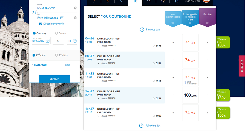 Когда я впервые посмотрел на расписание, то увидел что есть же и прямые поезда, вот же они! Но, облом: потомки Зигфрида не продают билеты на поезда, которыми управляют потомки Роланда, и наоборот. Таким образом, если хочется прокатиться без пересадок поездом класса Thalys, то нужно топать на сайт французской железной дороги и брать билеты там: