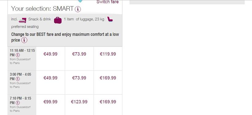 Ведь и в Дюссельдорфе и в Париже есть аэропорты, так почему бы не воспользоваться подобным поисковым сайтом для подбора авиабилетов между немецкой и французской воздушной гаванью? Внимание: авиабилеты стоит брать в аэропорт имени Шарля де Голля, так как аэропорт Орли расположен от Парижа достаточно далеко. Наиболее выгодно летать авиарейсами компании Eurowings. С расписанием ознакомиться можно на ее сайте или же на скриншоте с прямыми рейсами:
