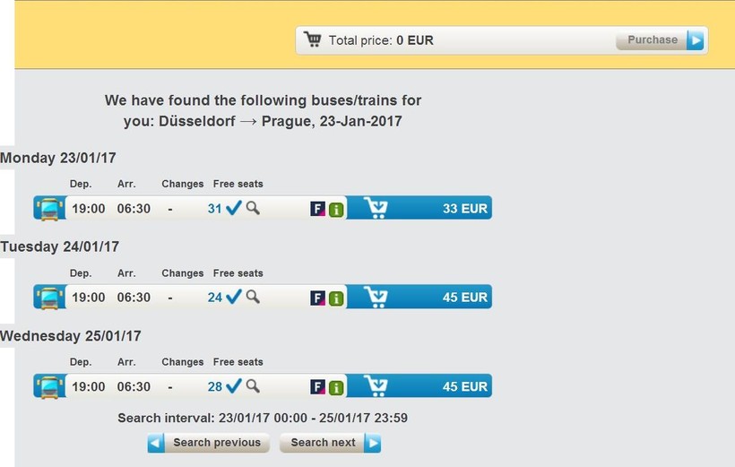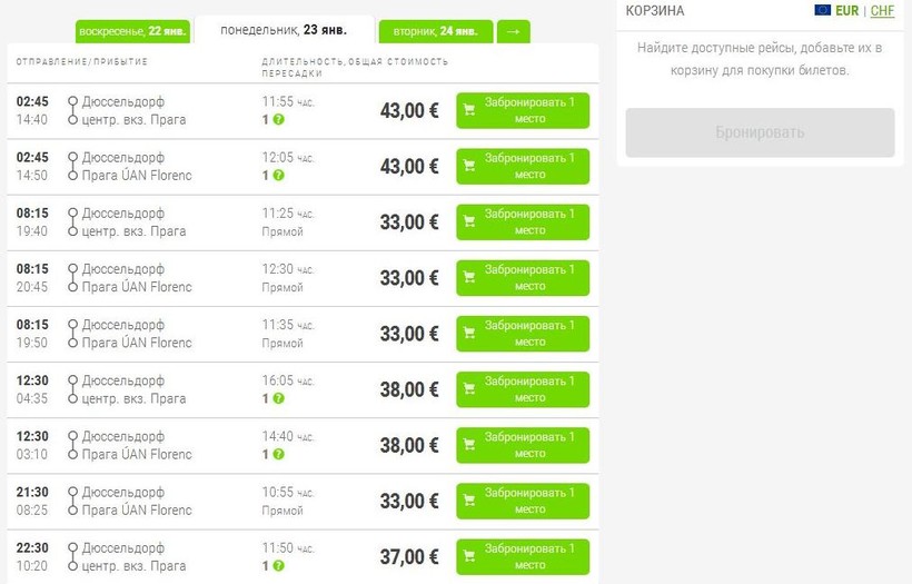 Я обнаружила два автобусных перевозчика, которые занимаются прямыми перевозками пассажиров между Дюссельдорфом и Прагой.