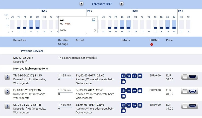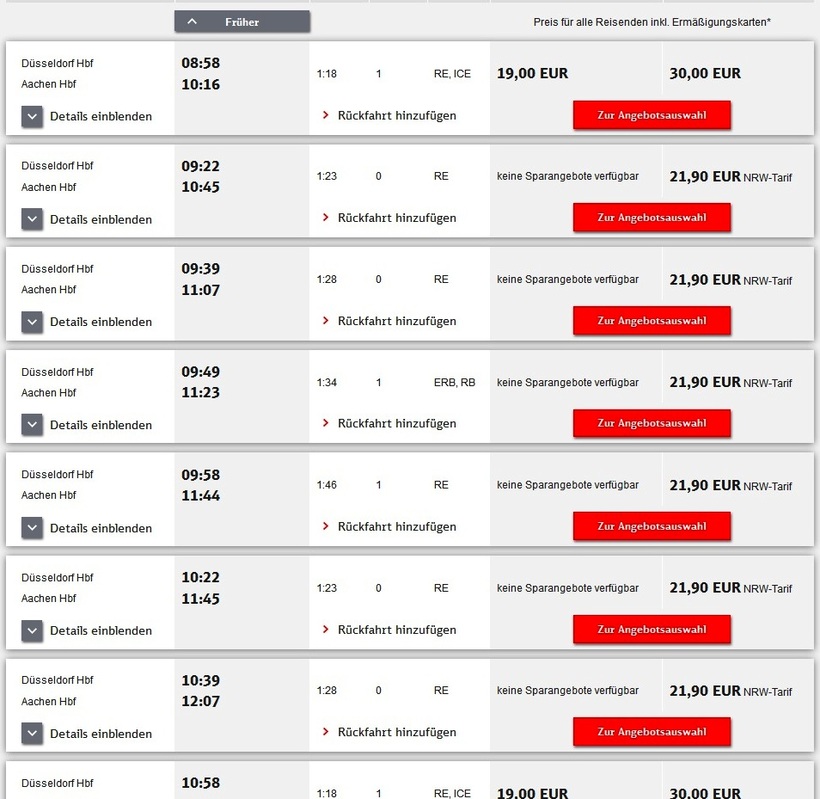 Ниже приведена информация о том, сколько часов вам потребуется, чтобы добраться от Дюссельдорфа до Аахена, а также приведена примерная стоимость проезда (средняя цена билета) на том или ином виде транспорта.