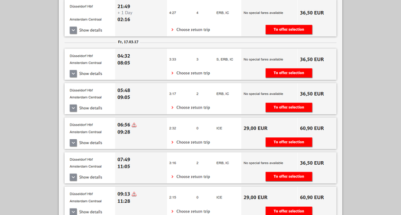 Прямых рейсов не очень-то много, их примерно треть от общего числа. Кстати, прошу обратить внимание при покупке билетов, что некоторые рейсы предполагают поездку на автобусе до Эйндховена, а уже там посадку на поезд, вот как на скриншоте: