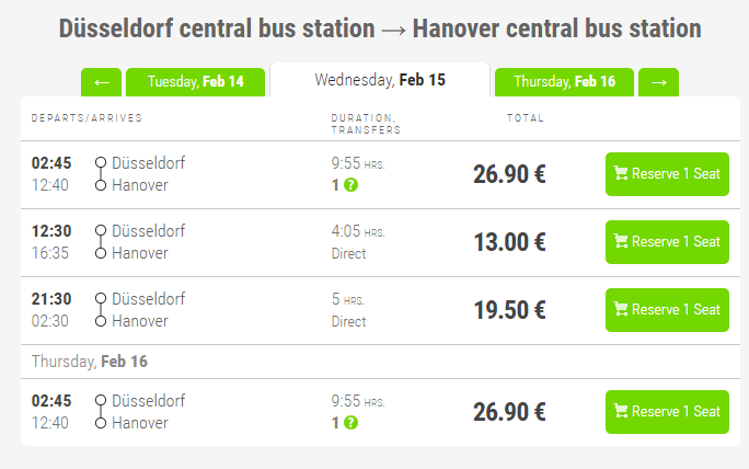 Перевозками пассажиров из Дюссельдорфа в Ганновер занимается компания Flixbus, на сайте которой и можно детально посмотреть расписание движения транспорта на нужную дату.