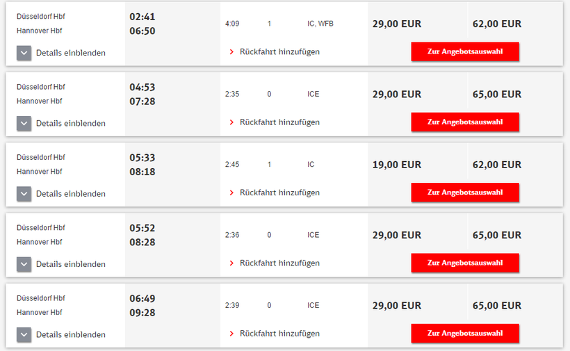 Ниже приведена информация о том, сколько часов вам потребуется, чтобы добраться от Дюссельдорфа до Ганновера, а также приведена примерная стоимость проезда (средняя цена билета) на том или ином виде транспорта.