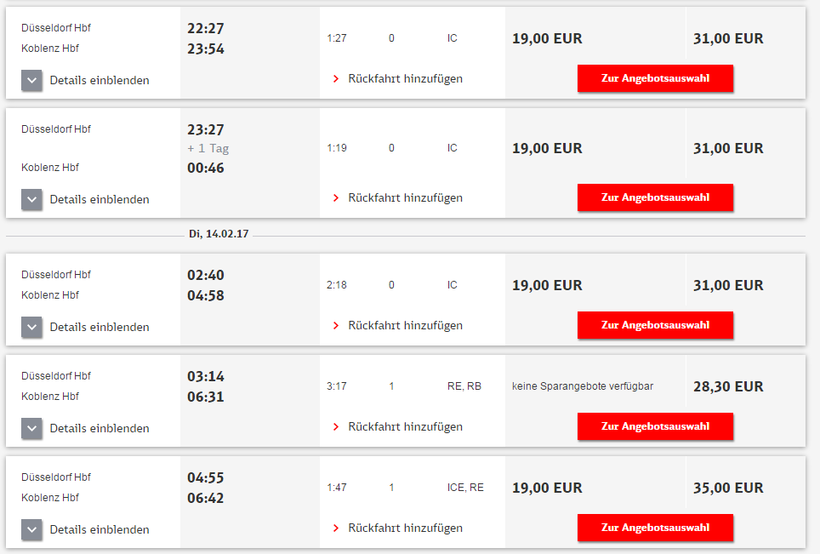 Между Дюссельдорфом и Кобленцем курсируют прямые поезда, которыми можно добраться за полтора - два часа, но если путешествовать с пересадками, то на час больше. Расписание указывать я не буду, подробно на конкретную дату его можно посмотреть здесь.