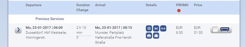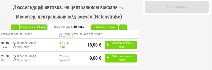 В день из Дюссельдорфа отходят два автобуса. Один утром, один ночью: Правда, утренний рейс, как видно, идет с пересадкой в Зигене, притом ждать придется достаточно долго – около часа, что обуславливает достаточно длительное суммарное время путешествия.