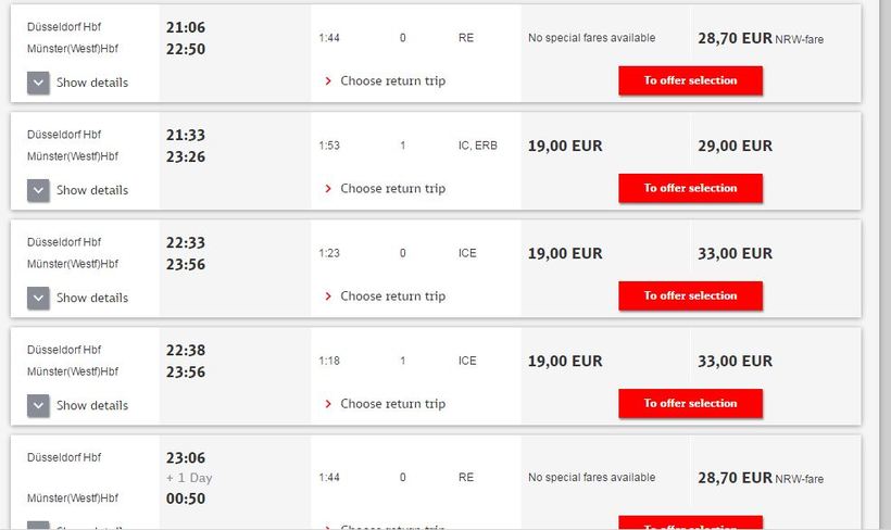Учитывая что расписание немецких поездов довольно переменчивая штука, я бы крайне рекомендовал проверять его на официальном сайте немецких железных дорог на каждый конкретный день.