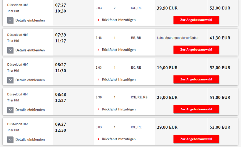 Ниже приведена информация о том, сколько часов вам потребуется, чтобы добраться от Дюссельдорфа до Трира, а также приведена примерная стоимость проезда (средняя цена билета) на том или ином виде транспорта.