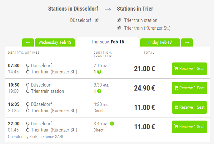 Добраться в Трир можно автобусом. Перевозками по такому маршруту занимается известная в Германии компания Flixbus, транспортом которой мне уже приходилось путешествовать. Не скажу, что осталась в восторге, но иногда экономия в несколько евро определяет и способ поездки. Ведь часто бывает, что билеты на автобусы Flixbus дешевле проездных на другие транспортные средства.