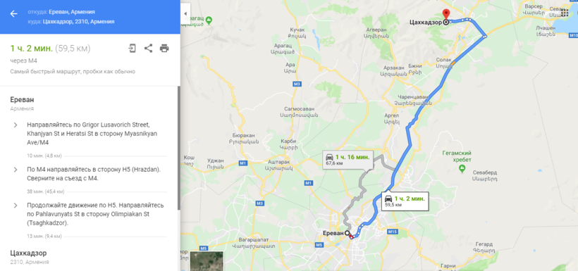 Столицу Армении и Цахкадзор разделяет около 60 километров. Если нигде не останавливаться, то на автомобиле вы сможете добраться в Цахкадзор за час. Машину можно арендовать на одном из сайтов, похожих на этот. Их много в сети. Стоимость аренды стартует от 37 евро в сутки. Дороговато, на мой взгляд. Но если планируете активно перемещаться по стране, этот вариант очень удобный. Цены на бензин, как по мне, адекватные — 0,80 евро за литр.