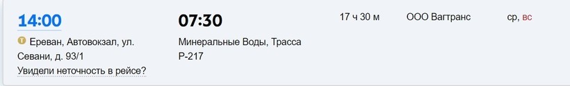 Есть вариант по средам и воскресеньям. Отправление в 14:00 с Центрального автовокзала в Ереване (улица Севани, 93/1). Этот автобус делает остановку также на трассе Р-217. В Минеральных Водах он примерно в 07:30 утра. Перевозку осуществляет ООО «Вагтранс».