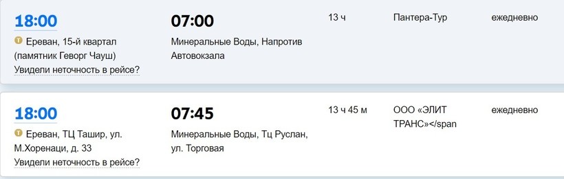 Из Еревана в Минеральные Воды выполняется два регулярных ежедневных рейса, которые отправляются от ТЦ «Ташир» (улица Мовсес Хоренаца, 33).
