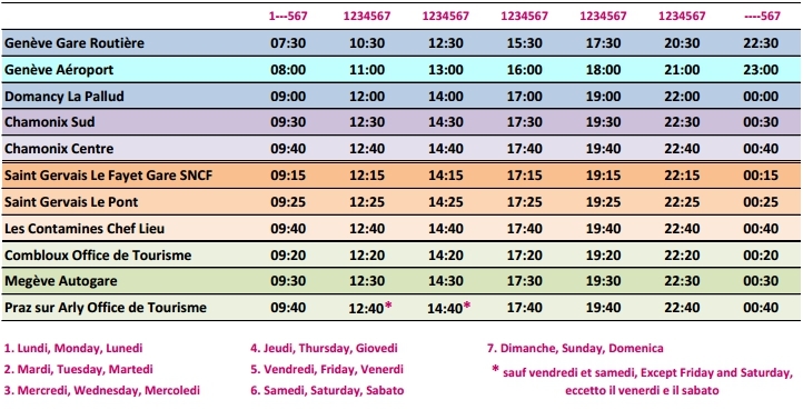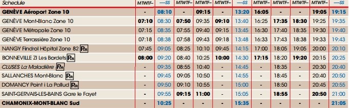 Если вы оказались в Женеве в выходной день или в один из национальных праздников, 25 декабря, 1 января и 17 августа, можно воспользоваться предложением компании Transalis. В эти дни автобусы компании делают из аэропорта Женевы в Шамони три рейса. Время в пути - два часа. Расписание можно посмотреть на сайте компании.