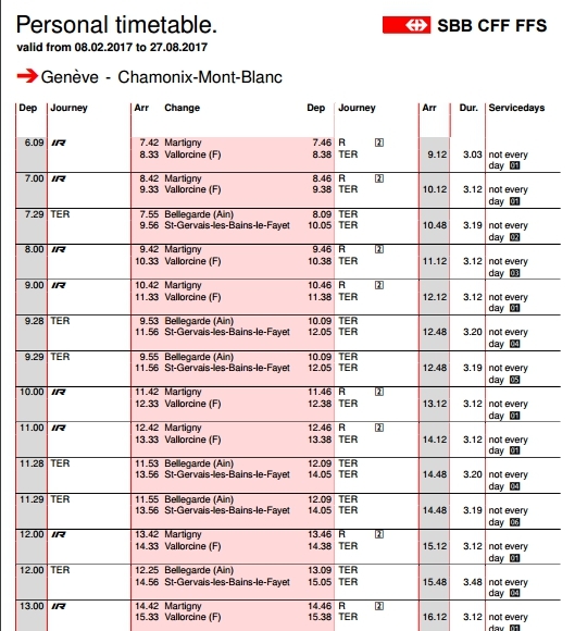 При таком разнообразии прямых автобусных маршрутов как из центра Женевы, так и из аэропорта, вариант с железнодорожным транспортом, так распространенным в Швейцарии, выглядит не очень привлекательно. Да и путь наш по большей части проходит по территории Франции. По железной дороге добраться до Шамони из Женевы можно минимум за три часа с двумя пересадками. Если все же решитесь на такое мероприятие, расписание удобнее смотреть на швейцарском сайте.