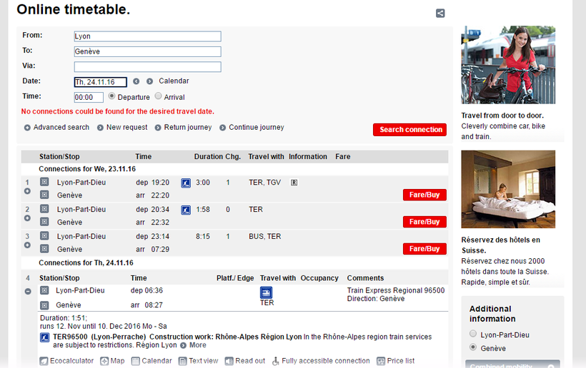 Приобрести билет удобнее всего через интернет. Для этого можно воспользоваться либо сайтом французских железных дорог, либо аналогичным швейцарским порталом.