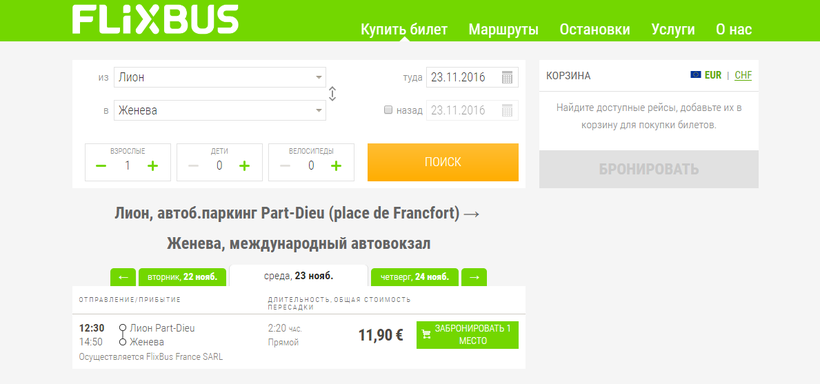 · FlixBus. Автобус этого перевозчика выезжает в сторону Женеву только раз в день в 12:30, прибывая в Швейцарию в 14:50.