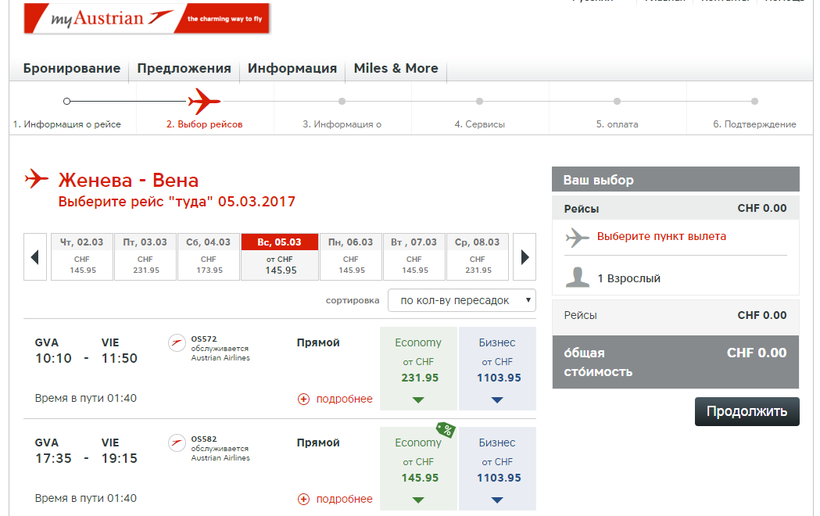 А вот так выглядит расписание полётов на австрийском сайте. Обратите внимание на стоимость билетов.