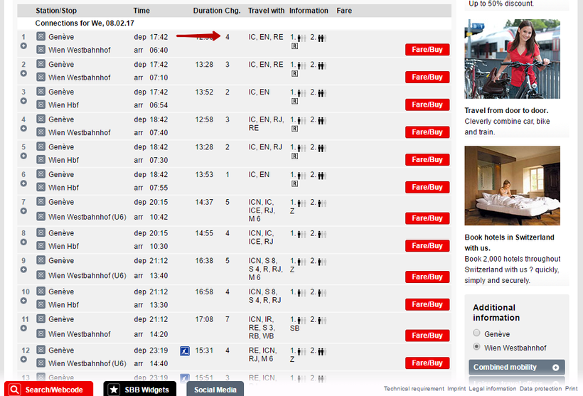 Обратите внимание, на количество пересадок в каждом рейсе. Это скриншот с официального сайта швейцарских железных дорог.