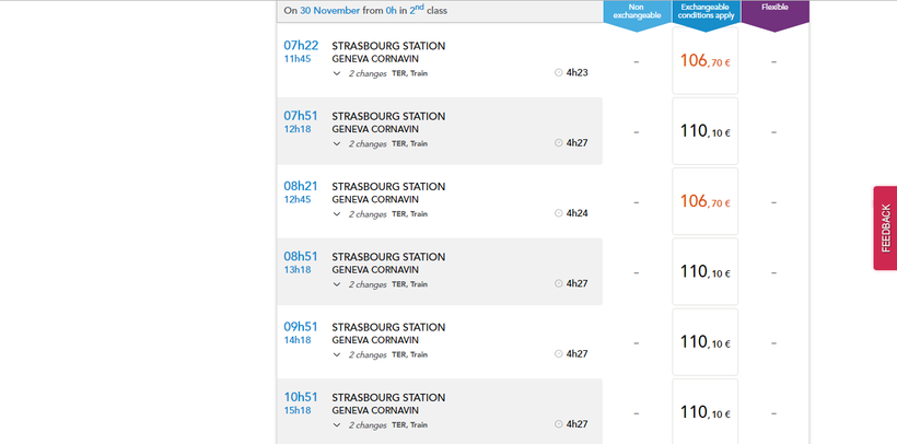 Поездка в Женеву на поезде выйдет очень дорогой. Самый дешевый билет обойдется в 106 евро, а вообще в среднем стоимость проезда составляет 110 евро.