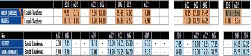 Оранжевым цветом отмечено время отправления и прибытия автобусов из Жироны в Фигерас.