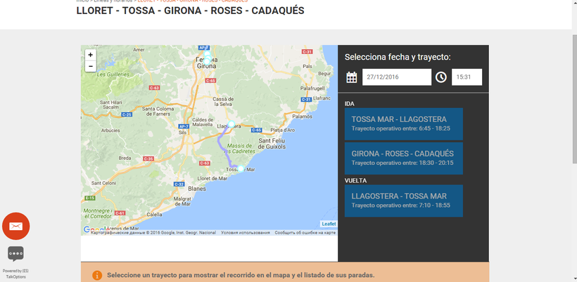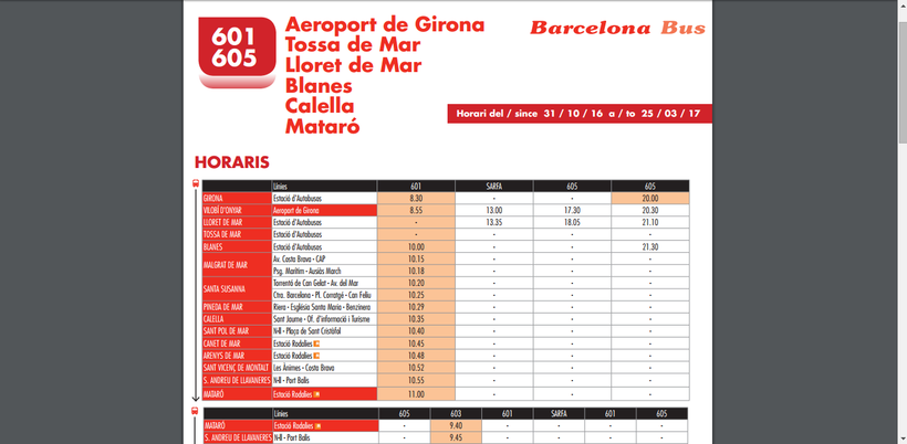 Даже если у вас нет машины и денег на такси, то не стоит переживать! Вы всё равно сможете доехать в Ллорет Де Мар, потому что из Жироны туда ходит много автобусов. С автовокзала Жироны можно уехать в Ллорет Де Мар на автобусе №4 компании «Moventis» и на автобусе №605 компании «Sagales». Автобус №4 ходит дважды в день, вот здесь можно посмотреть подробное расписание, автобус №605 ходит один раз в день в 8 вечера. Какой бы автобус вы ни выбрали в пути придётся провести целый час.