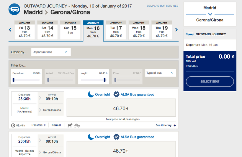 Билет на этот ночной автобус в Жирону обойдется в 47 евро.