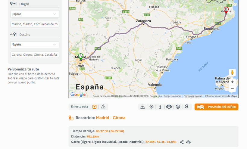 Расстояние между Мадридом и Жироной составляет 573 километра или 356 миль по прямой и 690 километров или 429 миль по автодорогам.