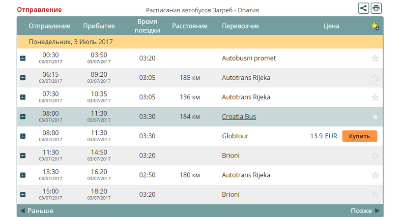 Если такое расписание вам неудобно, то можно сначала добраться до Риеки, а уже там пересаживаться на автобус, следующий до Опатии. Так как автобусов из Загреба до Риеки и из Риеки до Опатии очень много, то таким образом можно будет добраться в Опатию практически в любое время суток. Дорога займет около трех часов.