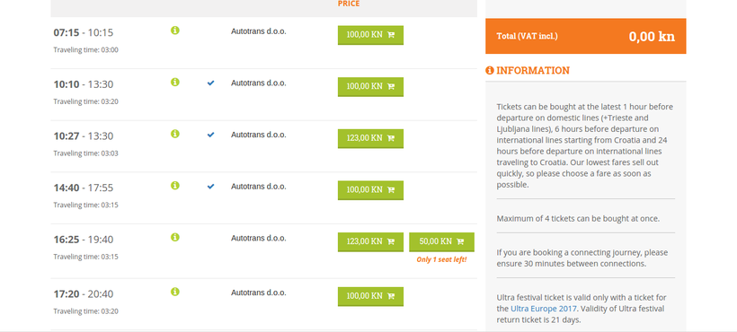 - Цена места в автобусе Autotrans колеблется от 50 (промо-предложение) до 123 кун (от 6,7 до 16,6 евро).