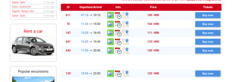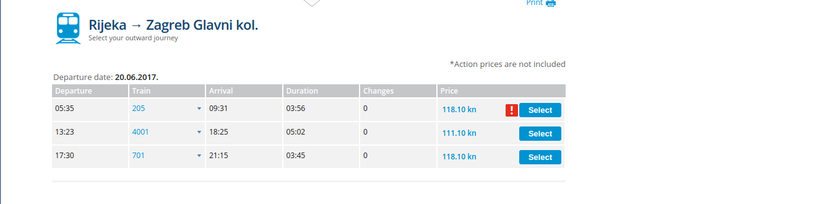 Железнодорожного вокзала в Опатии нет, поэтому сначала нужно будет добраться до вокзала в Риеке, именно он является ближайшей станцией. Но вообще, я не рекомендую этого делать. Просто предлагаю взглянуть на скриншот расписания по маршруту Риека-Загреб с ценами на билеты, и все станет понятным: