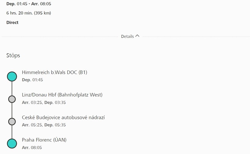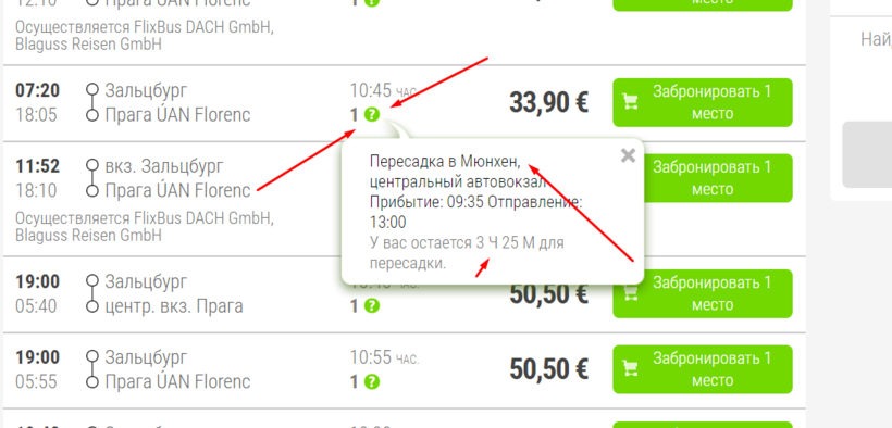 Автобусы могут идти через Германию, так что лучше уточнять маршрут на сайте. Узнать где пересадка можно нажав на знак вопроса.