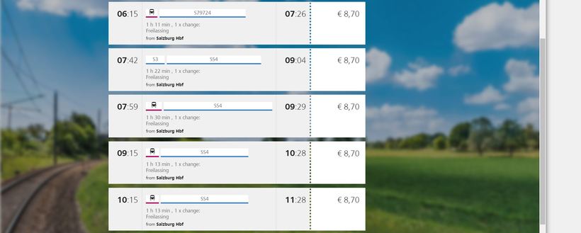 Железнодорожная сеть в Австрии везде развита неплохо. Но в данном случае доехать прямым рейсом точно не получится, в любом случае придется делать пересадку в Фрайлассинге. Вот скриншот с расписанием: