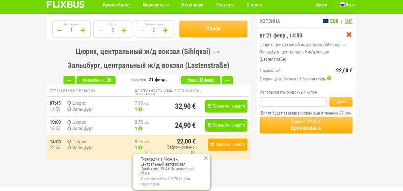 Оказалось, что из Цюриха в Зальцбург на автобусе компании FlixBus добраться реально, правда, придется сделать пересадку в Мюнхене. В принципе, это не критично, правда придется подождать свой рейс 1,5-2,5 часа, из-за чего дорога занимает больше времени. В итоге на поездку придется потратить 7-8 часов.