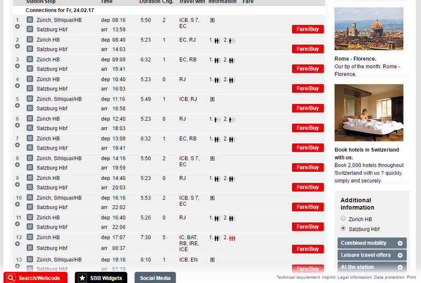 Отказавшись от идеи ехать в Зальцбург на автомобиле, я продолжила поиски далее. Первым делом я зашла на сайт швейцарской железной дороги. Здесь я выяснила, что добраться в Зальцбург из Цюриха можно без особого труда, причем есть даже несколько прямых поездов, отправляющихся в 06:40, 10:40, 12:40, 14:40, 16:40, 21:40. В пути нужно будет провести около 5,5-6,5 часов. Если же ехать с пересадками, то дорога может занять 7-9 часов.
