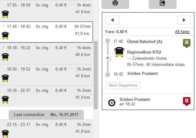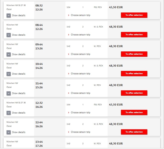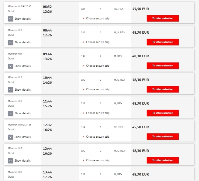 Поездки на немецких железных дорогах мне очень нравятся еще с нашего баварского отпуска, когда мы впервые ездили по Германии на общественном транспорте. Подробно о немецких железных дорогах, видах поездов, тарифах и акциях, способах покупки билетов вы можете прочитать здесь. Поезда с центрального железнодорожного вокзала Мюнхена в австрийский Этцель отправляются практически каждый час. Однако, все они с пересадками, по большей части с двумя, но можно найти рейсы и с одной, только в Инсбруке. Время в пути немногим менее 4 часов. Расписание можно посмотреть на сайте.