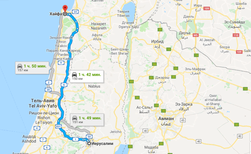 Расстояние между Иерусалимом и Хайфой составляет 73 километра или 45 миль по прямой и 152 километра или 94 мили по автодорогам.
