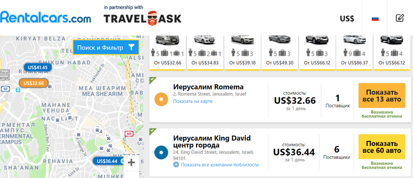 Поискать машину можно в разных поисковиках, например, здесь. Но нигде я так и не нашла вариант, чтобы взять машину в Иерусалиме, а оставить в Эйн-Геди: видимо, кибуц слишком маленький, и тут просто нет офисов контор, специализирующихся на прокате машин.