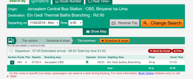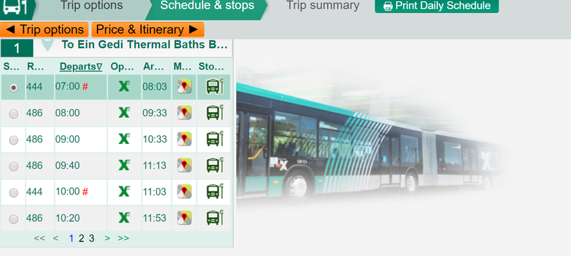 Между Иерусалимом и Эйн-Геди курсирует два автобуса: 444 и 486. Оба они едут в один и тот же кибуц, просто делают остановки в разных местах. Вообще в Эйн-Геди есть несколько остановок: