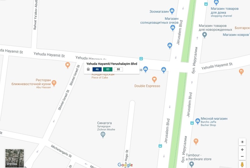 Или можно сесть на автобус, от станции Ха-Хагана идет автобус №46 (перевозчик Dan). Выйти можно на остановке Егуда А Мит (примерно 10-ая), это между бульваром Иерушалим и улицей Яфит.